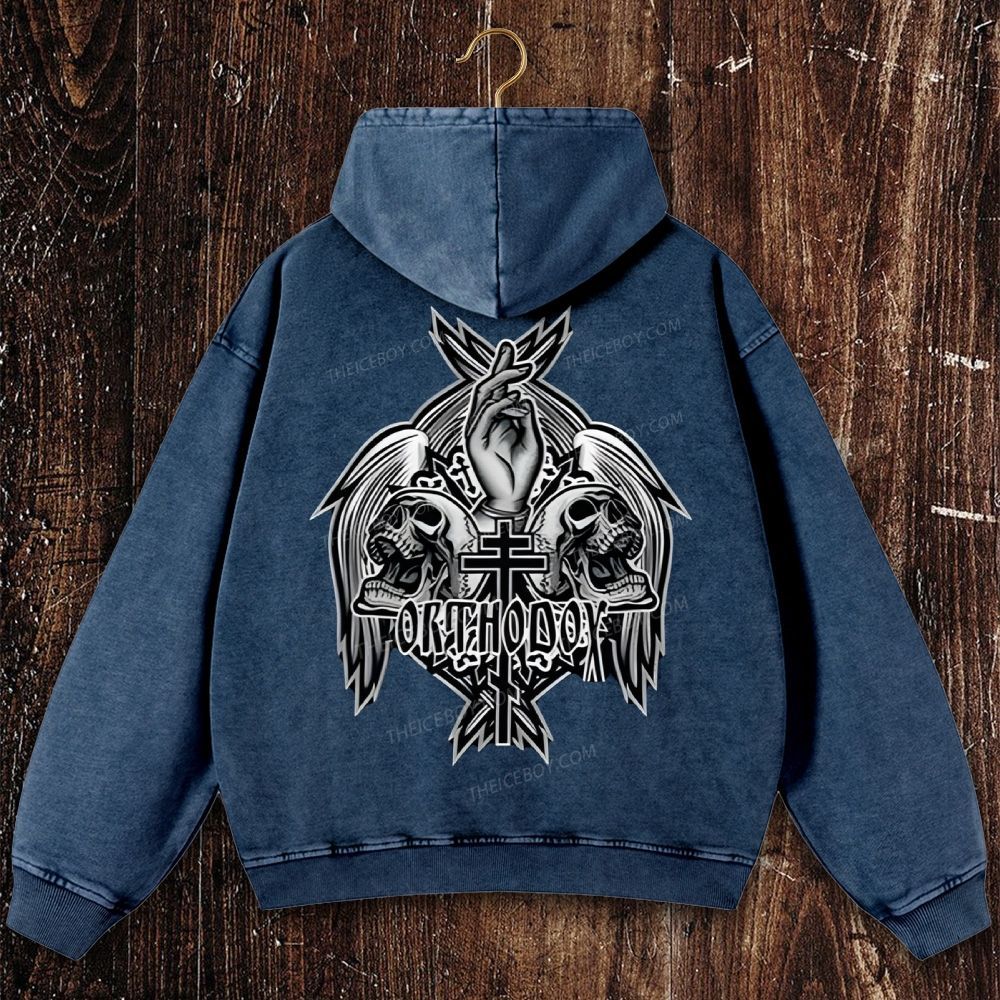 Orthodox Or Death skull with six wings and cross Christian Washed Hoodie